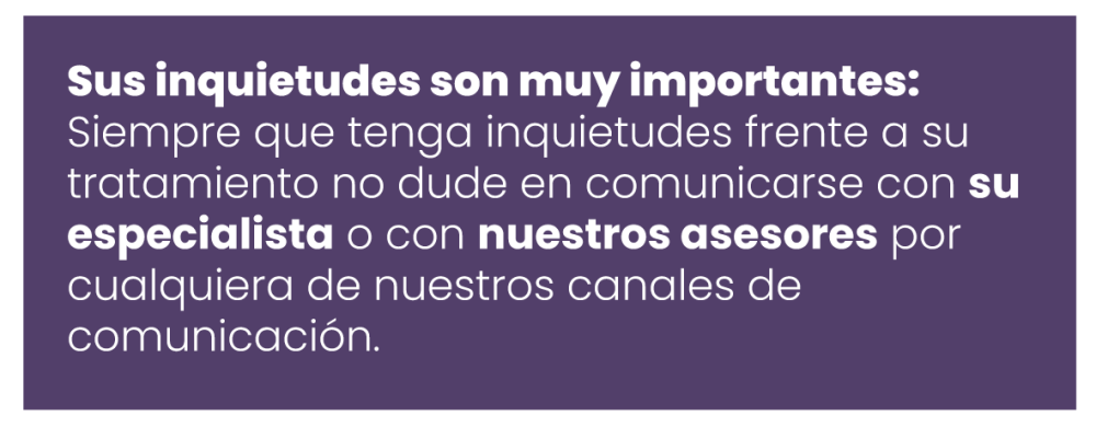 Adherencia a la terapia: Recuerde seguir todas las recomendaciones dadas por el especialista, ser frecuente con su tratamiento; usar estrategias de recordación para la aplicación y/o consumo de sus medicamentos como pueden ser las alarmas en su teléfono móvil.