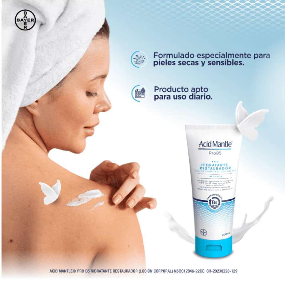 ACID MANTLE Pro B5 Loción Corporal Piel Seca es fundamental tener en cuenta que la piel seca puede afectar cualquier parte del cuerpo, por lo que es esencial mantener una hidratación adecuada en todo el cuerpo. Para lograrlo, te recomendamos el Hidratante Restaurador Loción Corporal Uso Diario, que ofrece una hidratación inmediata y duradera de hasta 48 horas, dejando tu piel suave y saludable.