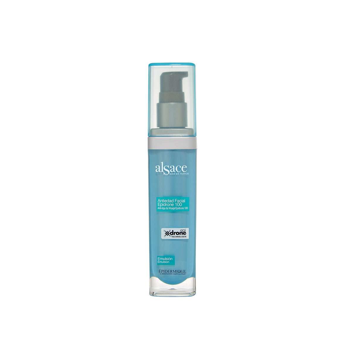 Alsace antiedad Epidrone 100, combate el envejecimiento gracias a su tecnología Epidrone con 4 drones, ésta tecnología está diseñada para liberar, de manera inteligente, sus componentes dentro de las células, reactiva producción de colágeno, ácido hialurónico y elastina, mejorando así la luminosidad de la piel, inhibe la contracción muscular evitando la formación de arrugas por gesticulación, manteniendo un efecto lifting mientras su utiliza, tiene propiedades antiedad, antiarrugas y reestructurante que aporta luminosidad e hidratación a la piel del rostro. Libre de parabenos y de fragancia.