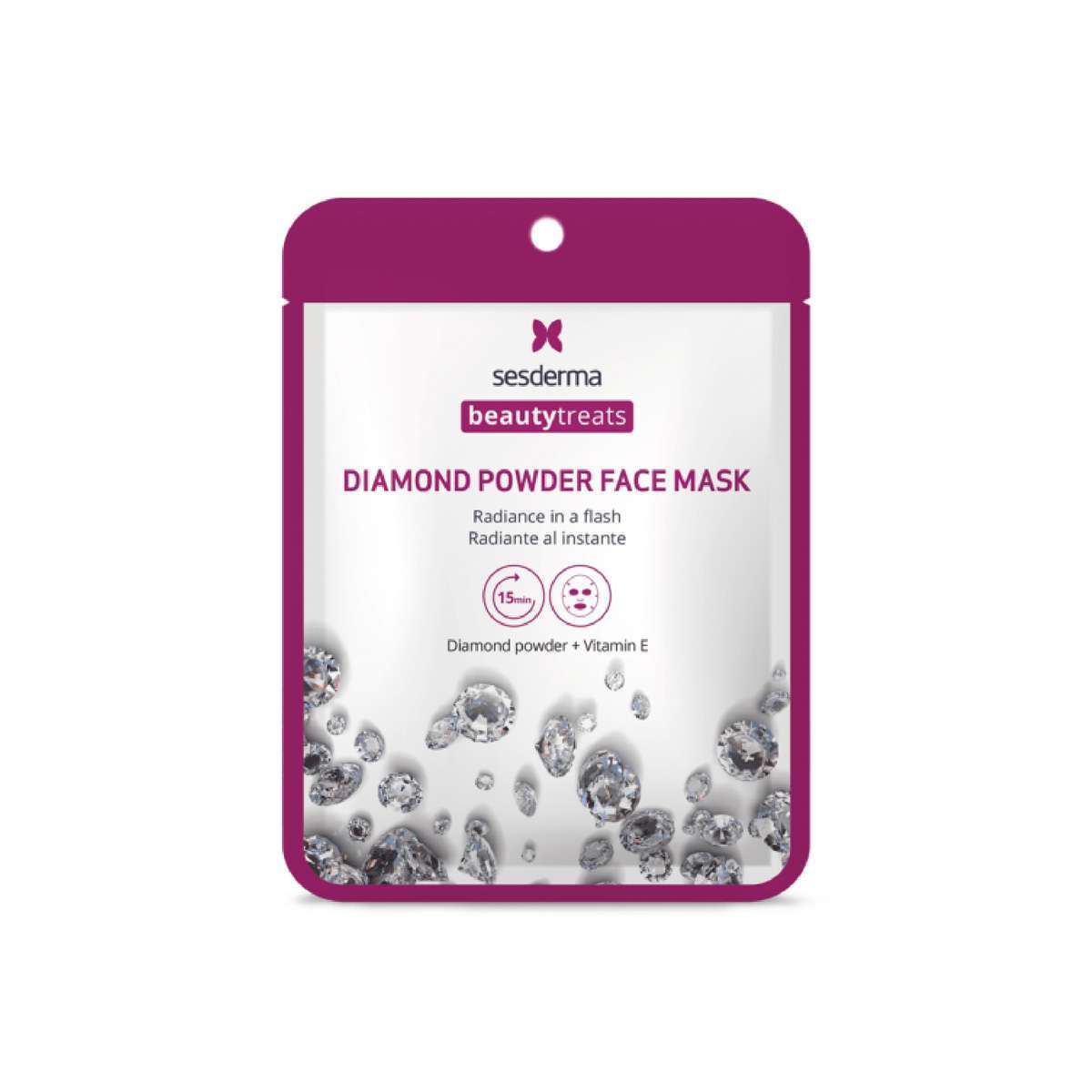 Diamond powder mask contiene Polvo de diamante que reduce imperfecciones y devuelve a tu piel su luminosidad, frescura y aspecto saludable. Además, por su contenido en oro 24K renueva y estimula la producción de elastina y colágeno. Y la Vitamina E acelera la regeneración de tejidos.