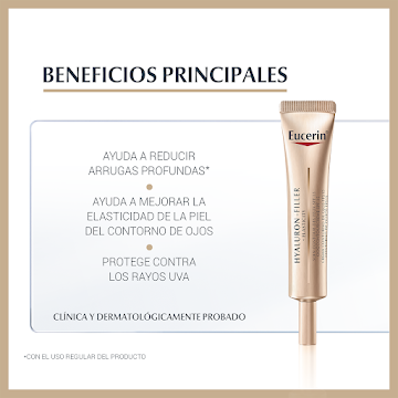 Eucerin Hyaluron-Filler Elasticity Contorno de Ojos FPS 15 está formulado para reducir visiblemente arrugas profundas, mejorar la elasticidad y devolver firmeza a la delicada piel del contorno ocular.