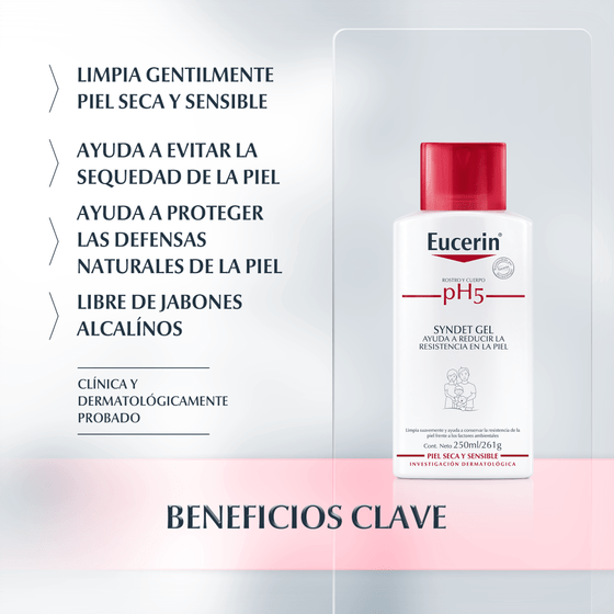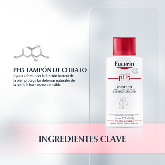 Eucerin pH5 Gel de Baño carece de jabón en su formulación para una limpieza suave pero efectiva de la piel sensible. Su combinación del Tampón Citrato pH5 y de surfactantes extra suaves ayuda a proteger la actividad enzimática de la piel, manteniendo su función de barrera y previniendo la deshidratación.