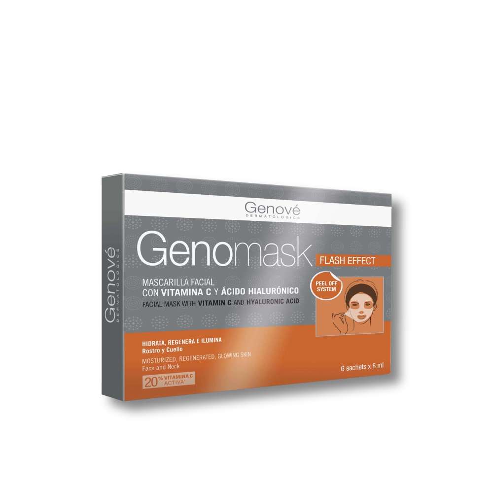 GENOVÉ Genomask Mascarilla Facial proporciona un efecto inmediato, dejando la piel suave, tersa y fresca. Formulada con un complejo antioxidante innovador, que combina B-ciclodextrinas y Ácido L-Ascórbico, esta mascarilla favorece la liberación gradual de la vitamina C, mejorando su penetración. El ácido ascórbico estimula la síntesis de colágeno, contribuyendo a mantener una piel joven y saludable.