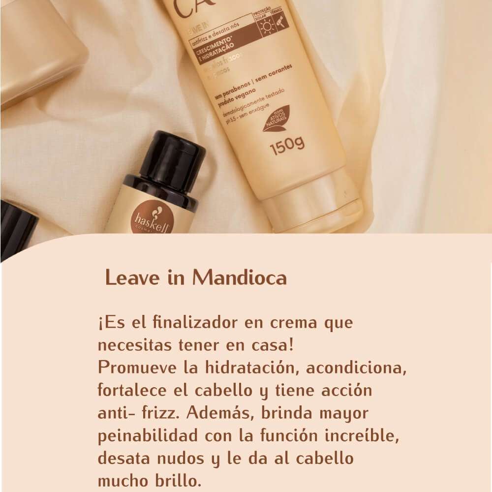 Leave In Mandioca finalizador en crema, está diseñado para pelos débiles y sin brillo. Hidratante y anti-frizz, ofrece protección térmica y solar sin necesidad de enjuague. Acondiciona, fortalece y protege contra agresiones externas, con un pH de 3,5.