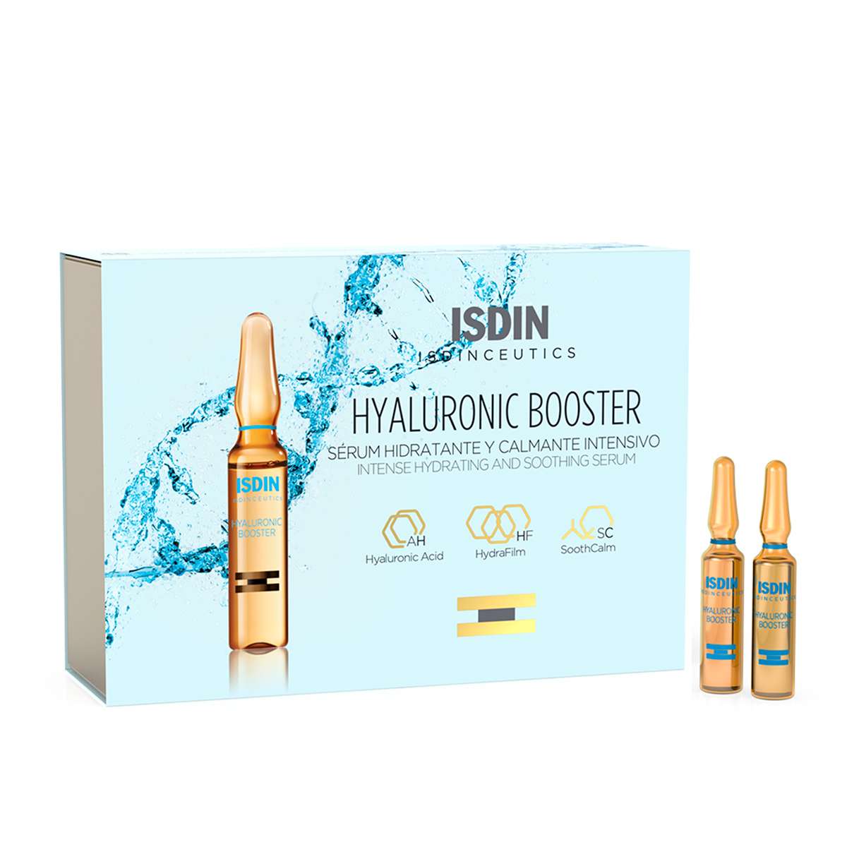 Sérum hidratante y calmante intensivo. Solución facial en ampollas con una avanzada combinación de dos moléculas de ácido hialurónico, de medio y bajo peso molecular, que ayudan a la piel a recuperar sus niveles de hidratación para conseguir una piel radiante.