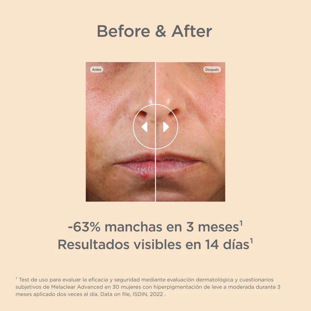 Modo de uso: Aplica Melaclear Advanced 2 veces al día, por la mañana y/o la noche, sobre rostro, cuello y escote. Se recomienda un uso mínimo de 3 meses.