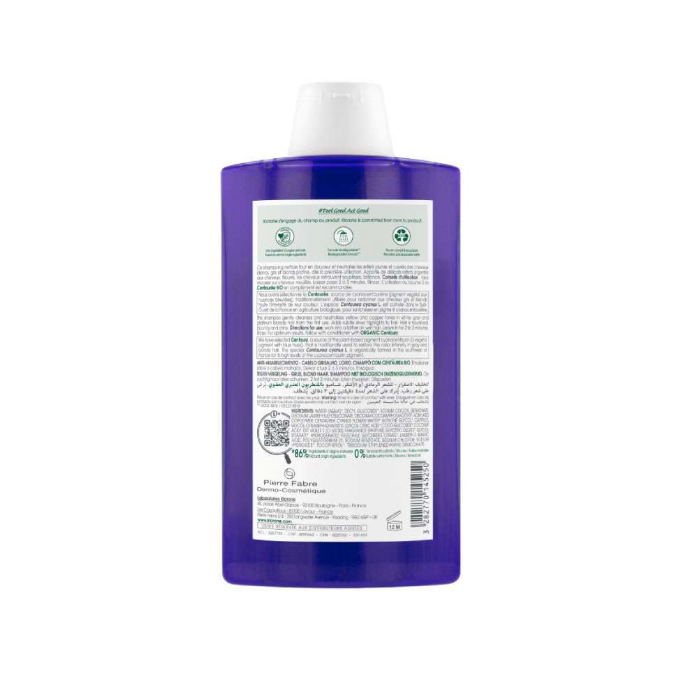 Champú que matiza el cabello canoso. Reaviva la belleza y la luminosidad de los cabellos grises y/o blancos, neutralizando su color amarillento, gracias a que contiene flores que se recogen a mano y se secan protegidas del sol para preservar la calidad de la cianocentaureina.
