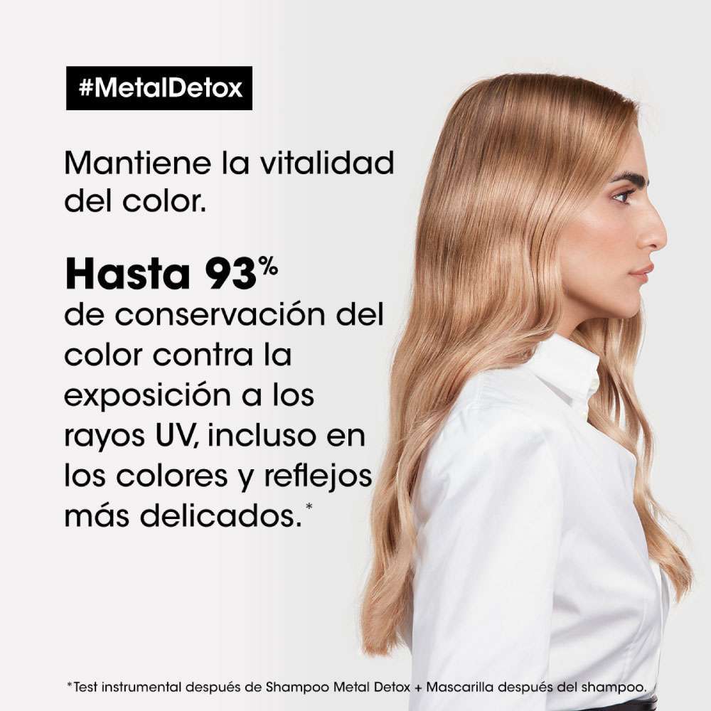 Mascarilla Metal Detox que protege la fibra del depósito de nuevos metales en la fibra capilar. El cabello intensamente nutrido y brillante.