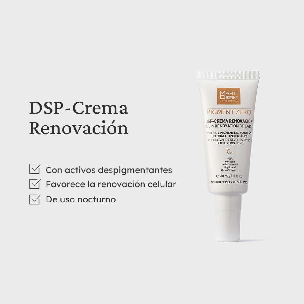 MARTIDERM Pigment Zero DSP Crema Renovación ayuda a unificar el tono de la piel y trata las irregularidades de manera selectiva, actuando exclusivamente en las áreas de pigmentación y previniendo su aparición. Además, contiene alfa hidroxiácidos naturales que favorecen la renovación celular y potencian la eficacia de los demás ingredientes.