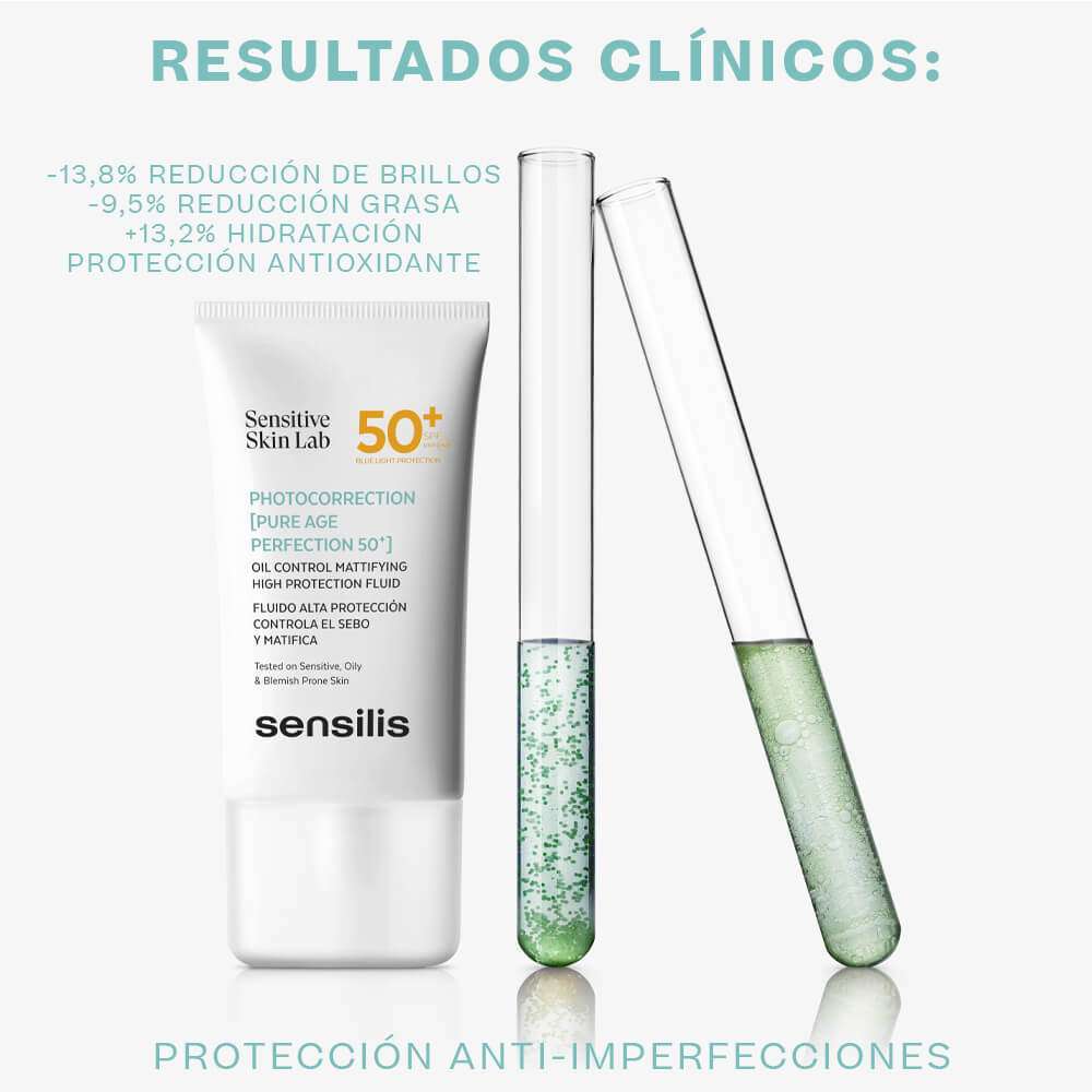 SENSILIS Photocorrection Pure Age Perfection 50+ es un fluido de alta protección 50+ que regula la producción de sebo, matifica y protege las pieles delicadas, grasas y propensas a brotes contra los rayos UVA, UVB y la luz azul.